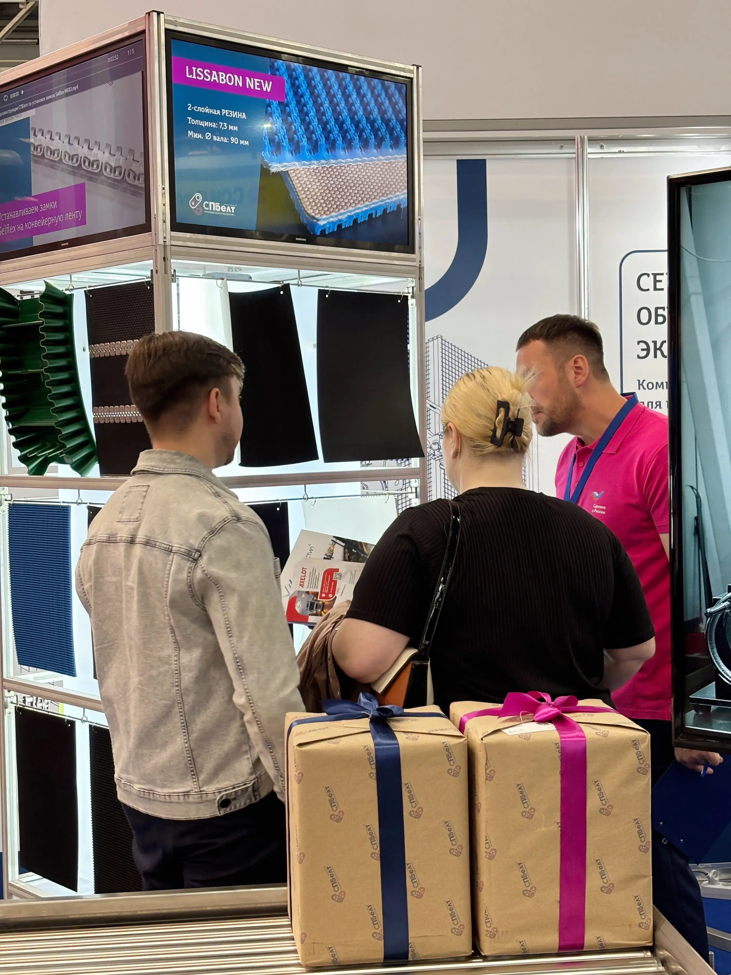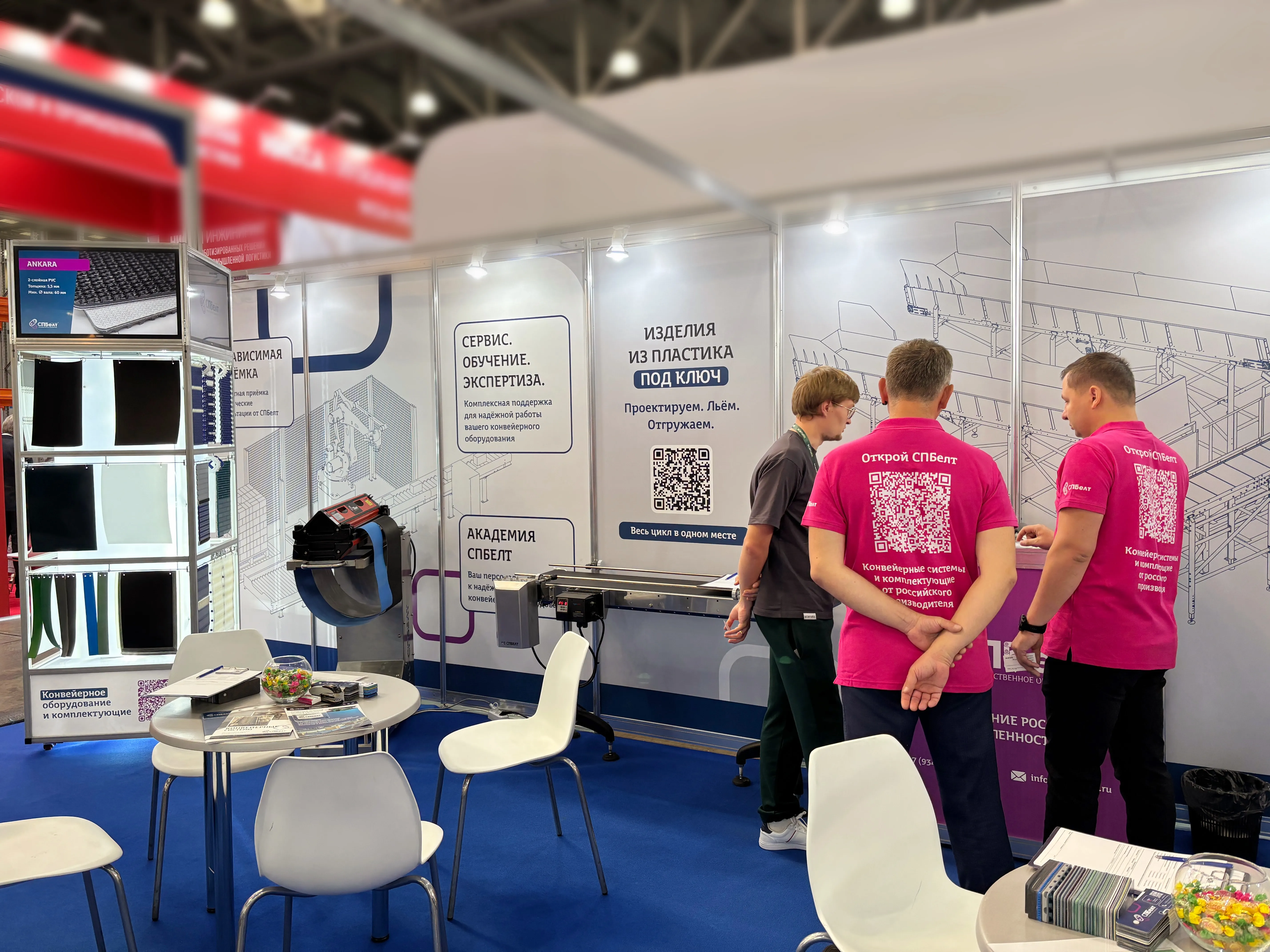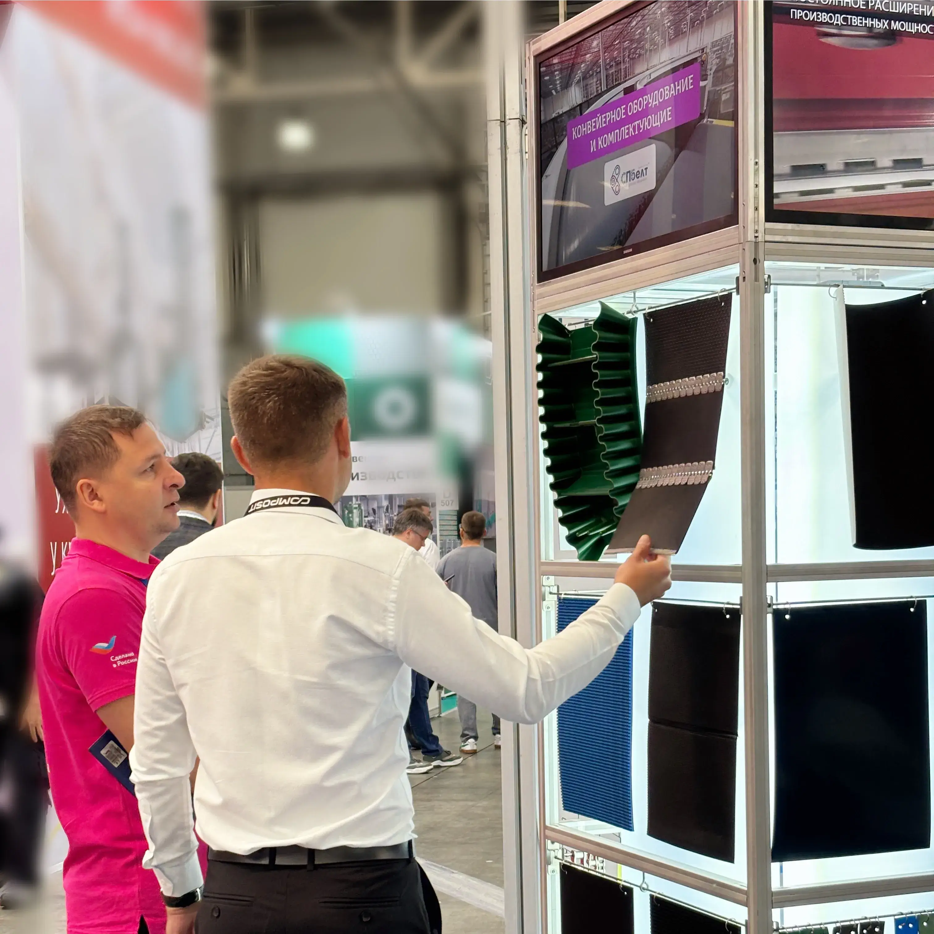 На нашем стенде были продемонстрированы:- Поворотный конвейер с уникальной системой фиксации ленты, позволяющей заменить её за 20 минут силами двух инженеров. Решение вызвало живой интерес благодаря удобству обслуживания и сокращению простоев производства.